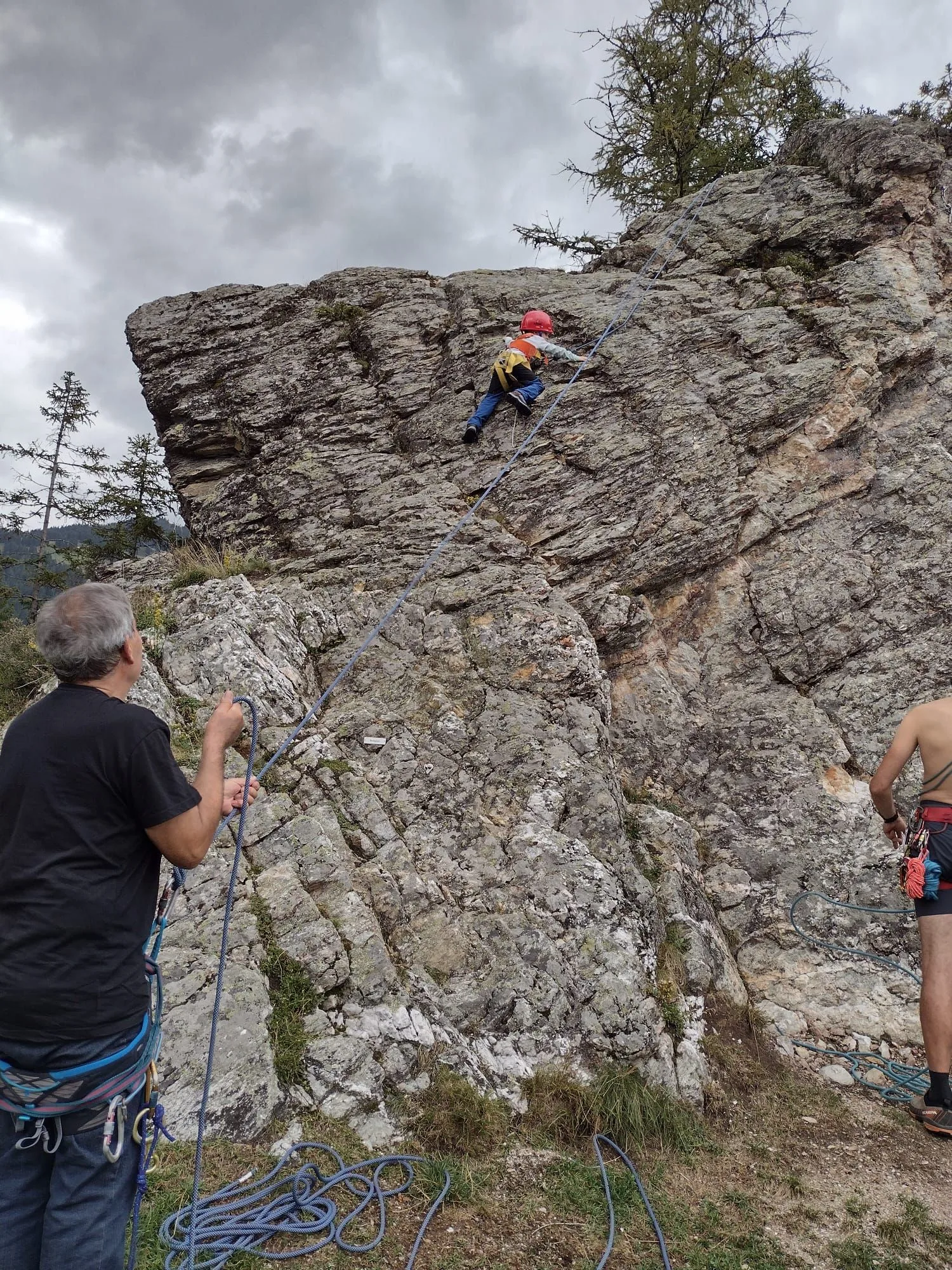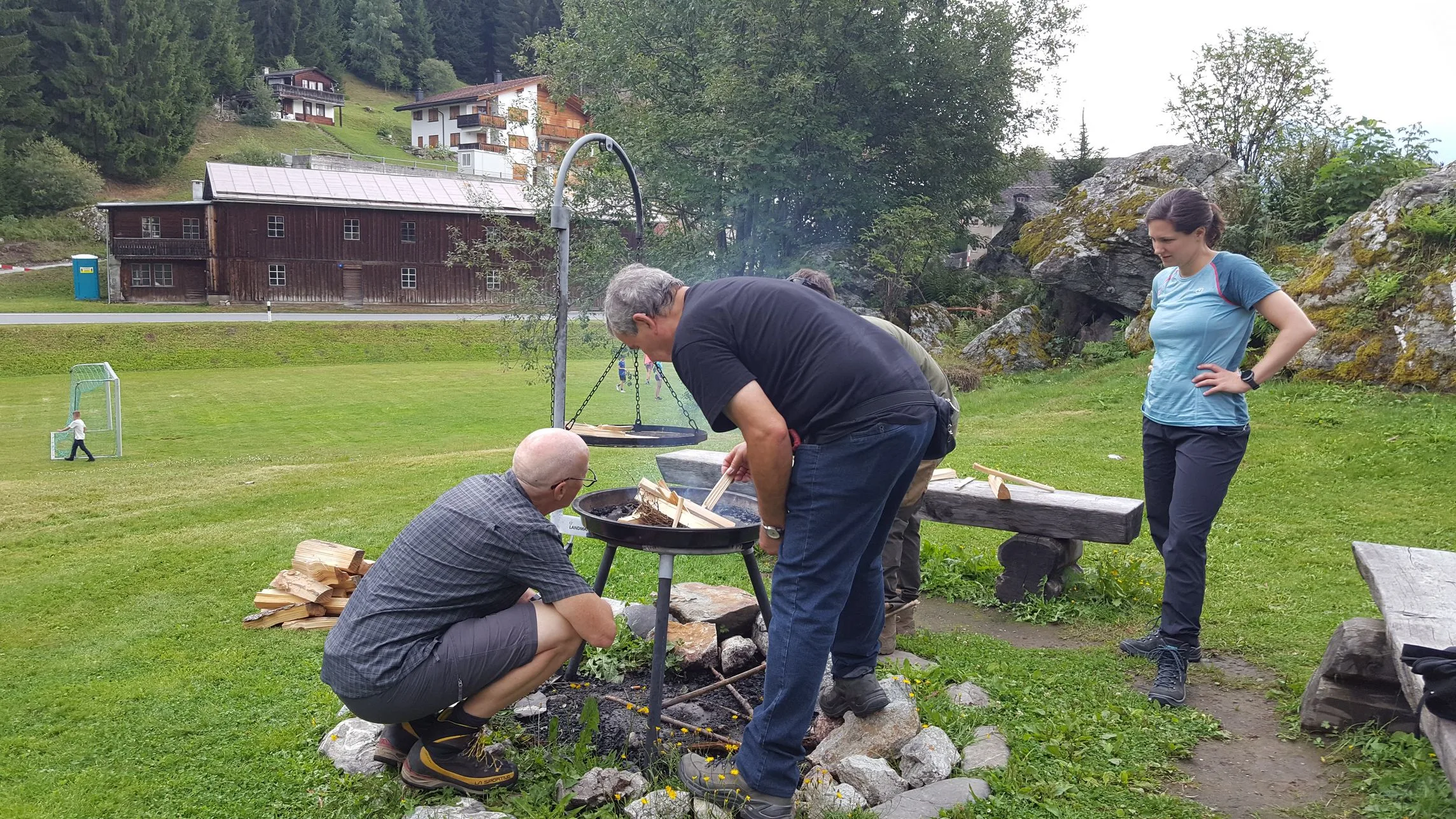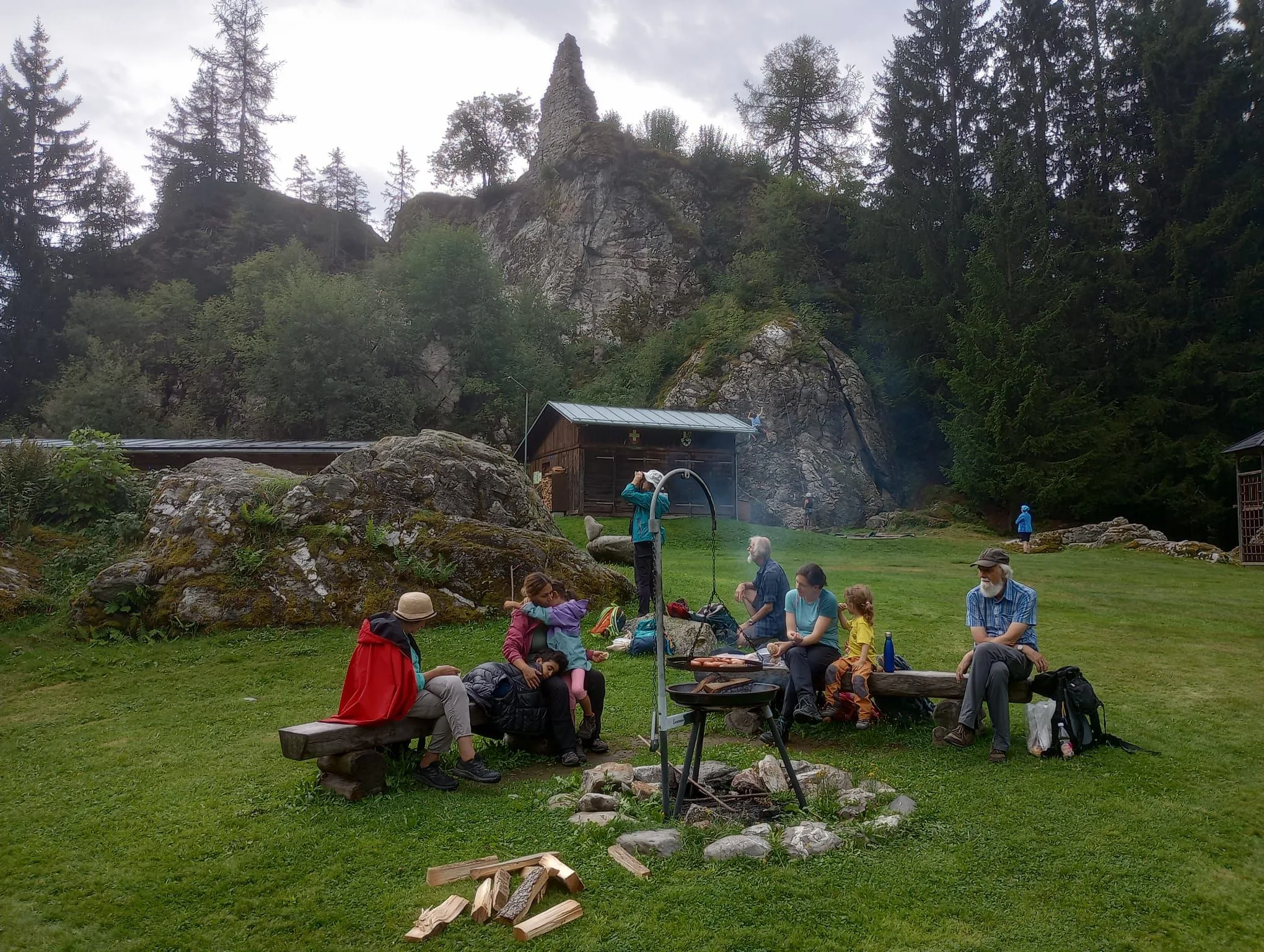Zügig wurden die Zimmer bezogen und schon bald waren alle abmarschbereit für den Platz oberhalb des Dorfes wo die Brätlistellen sind. Denn allen knurrte der Magen. Nach so langer Fahrt mit dem Auto sehr verständlich. Noch war das Wetter uns hold. So wurden die Kletterstellen eingerichtet und schon bald kraxelten die Kids die griffigen Felsen hoch. Derweil die Erwachsenen den jungen Talenten zuschauten, oben bei den Kletterfelsen, unten bei der Brätlistelle miteinander plauderten oder sich rund um die Burgruine Friberg, bzw. um die Felsen auf der diese steht, umschauten.