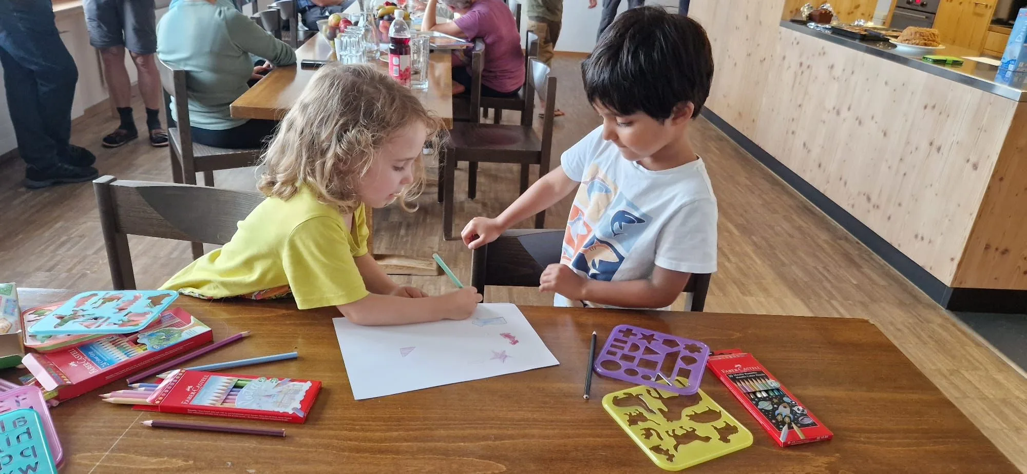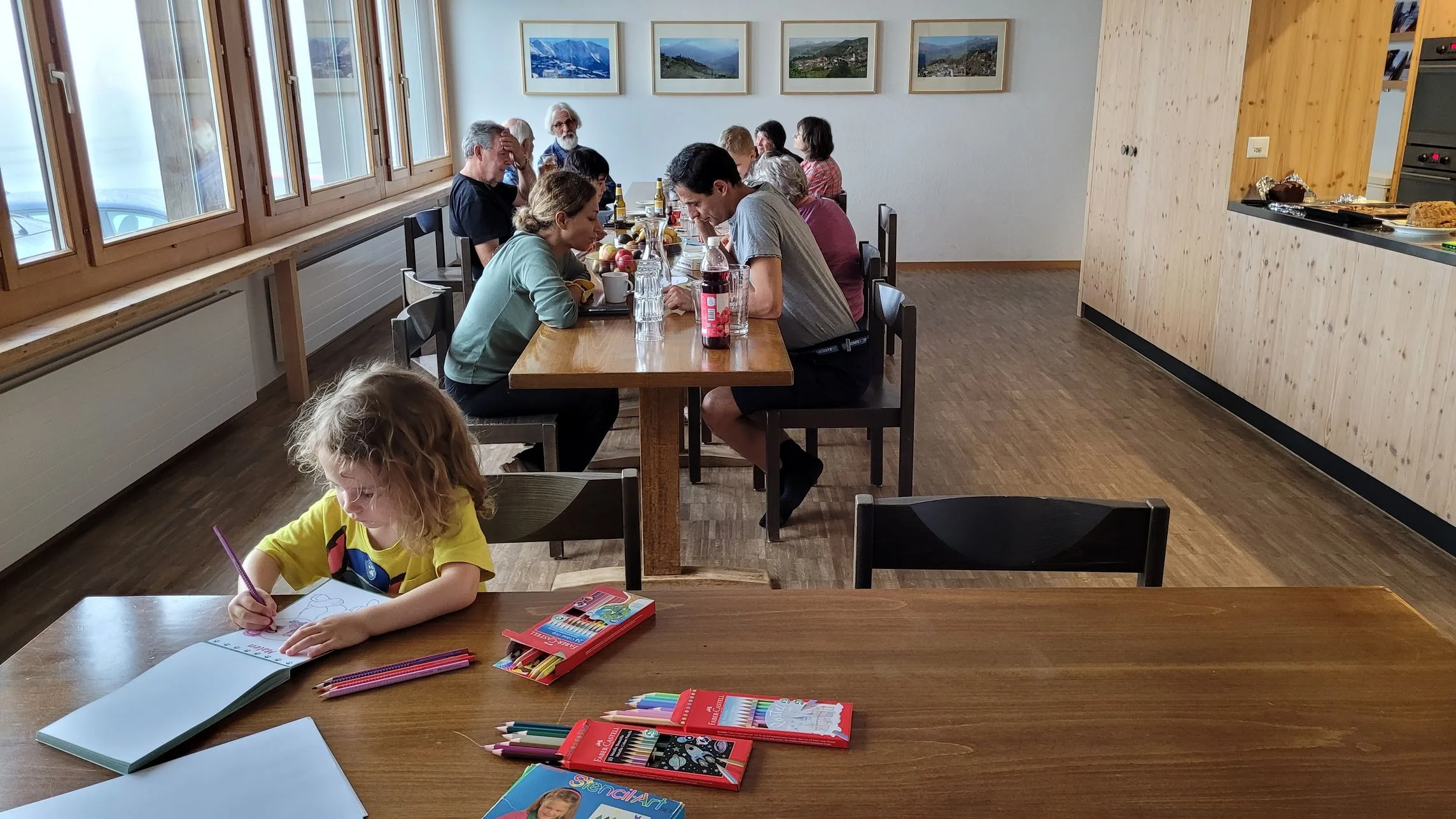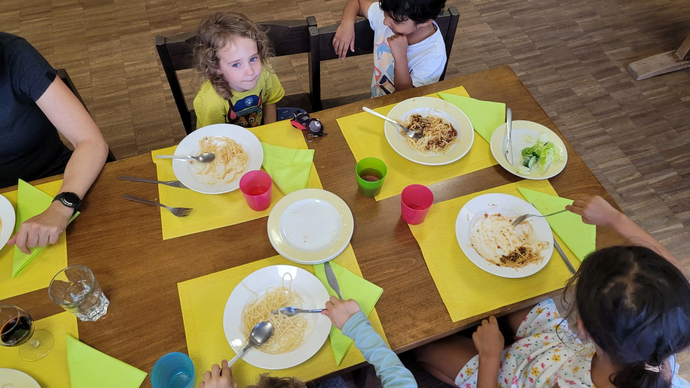 Bevor sich der Regen richtig ausbreiten konnte, waren wir in der Casa Sentupada unserer Unterkunft. Bei Spiel, Spass und sich austauschen verging die Zeit im Flug und schon konnten wir uns am lecker aufbereiteten Buffet unserem leiblichen Wohl widmen. Es gab Spaghetti mit zwei verschiedenen Saucen und dazu einen farbigen Salat. Wer konnte das schon ablehnen. Auch von den ganz jungen Teilnehmern war während dem Schmaus nicht mehr viel zu hören.