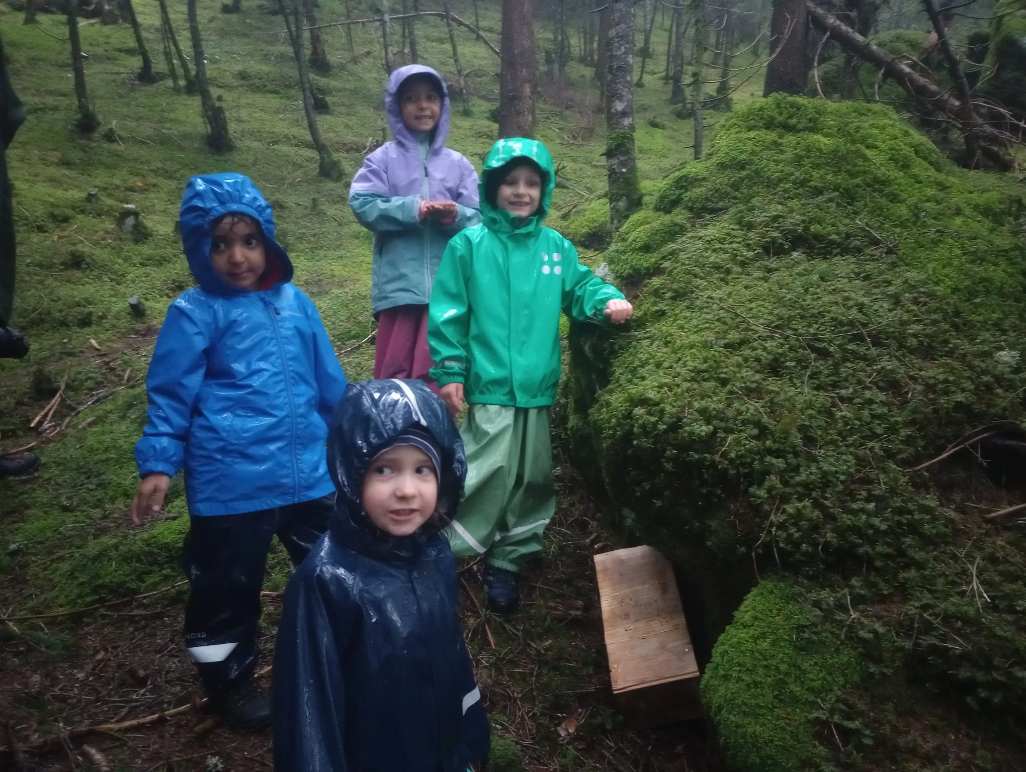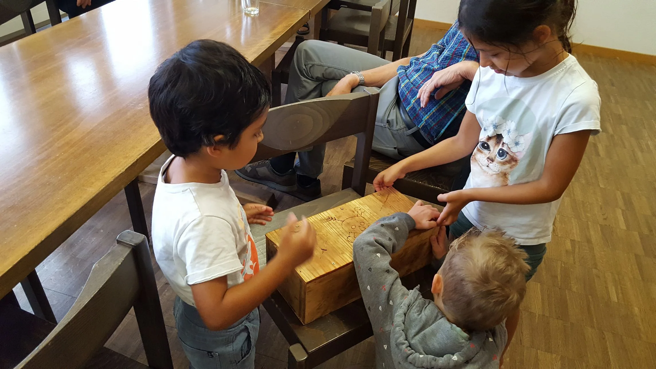 Der nächste Tag klärte, jedenfalls wettermässig nur eines, ein nasses und kühles Klima. Sicher störte das die Kinder nicht. Da der Hinweis auf einen 400-jährigen Schatz eben doch gefunden wurde, Wetter hin oder her, wurden die Kinder wasserdicht verpackt, die Erwachsenen wohl oder übel mit Schirm und Regensachen. Die Suche begann bei der Casa Sentupada. Immer wieder wurden neue Hinweise auf die nächste Fundstelle gefunden. Tatsächlich wurde die Kiste in Moos gebettet gefunden. Da sich die Kiste nicht so einfach öffnen liess mussten sich die Finder gedulden, denn erst der in der trockenen Unterkunft wurde dann die Kiste (mit einem Torx-Schraubendreher) geöffnet. Das Werkzeug war den Kindern egal, denn für jedes war etwas da drin…