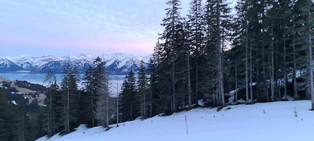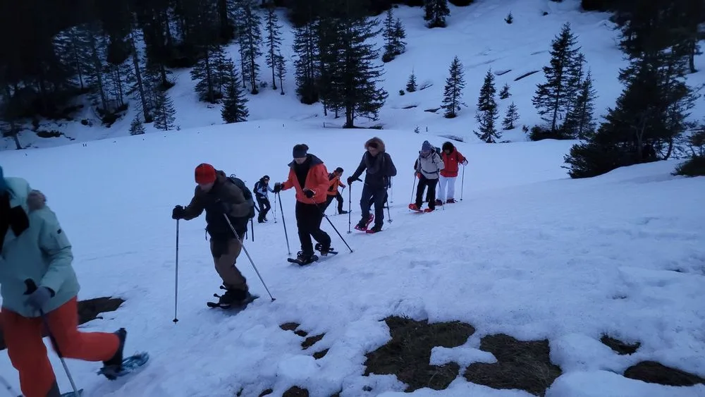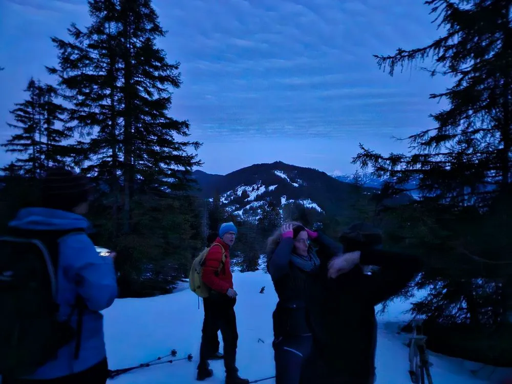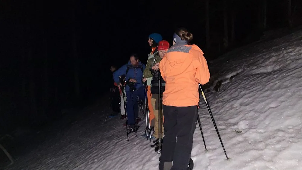 In der inzwischen fortgeschrittenen Abenddämmerung stapfte die doch ansehnliche Gruppe bergwärts. Notabene mit Schnee unter den Füssen. Hinter uns lagen ein Kaffee im Langis, ein traumhaftes Panorama im Sonnenuntergang und die Chilbi rund um das stattfindende Langlaufrennen.