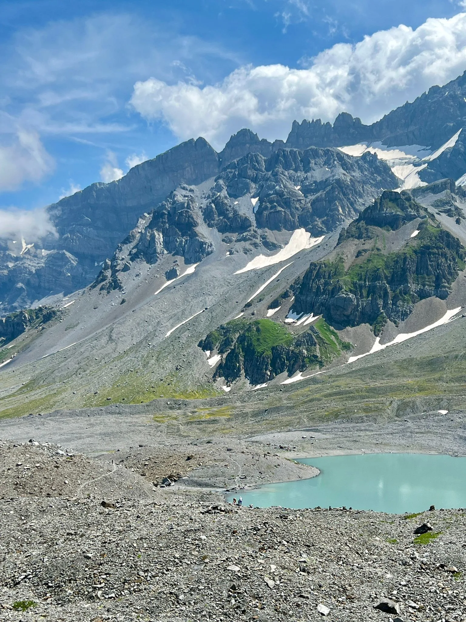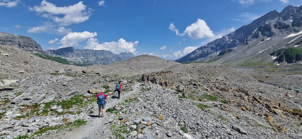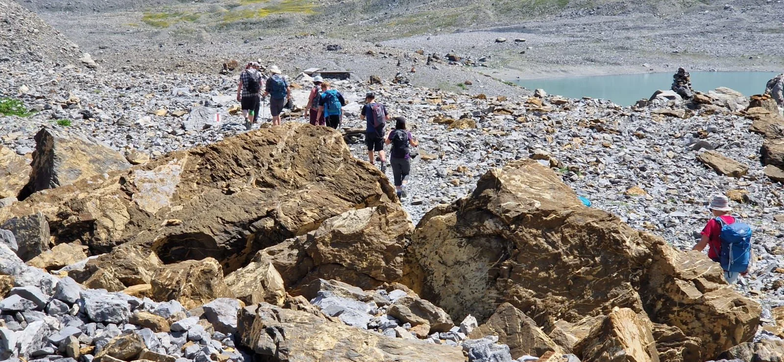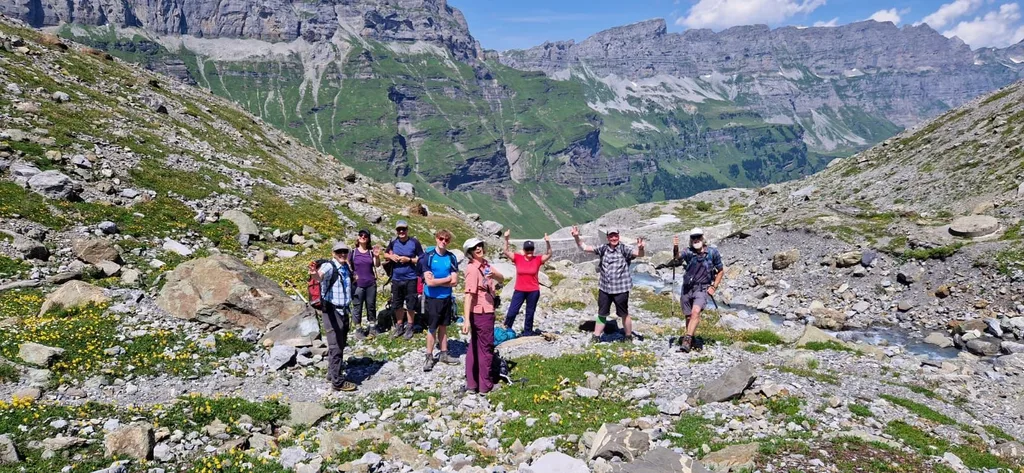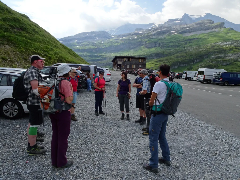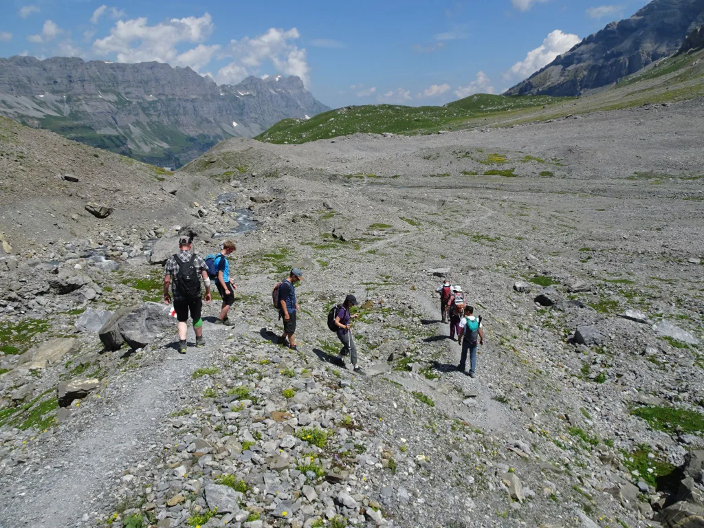 So trafen sich aber 10 stramme Wandernde beim Hotel Klausenpass zum Kaffee. Danach ging es los. Bei schönstem Wetter zogen wir Richtung Klausenpass, der Weg gesäumt von saftigem Grün und herrlich blühenden Blumen. Über Mälchbödemli erreichten wir den kleinen See Im Gries. Dieser entstand in den letzten Jahren aus dem Nichts, gleichzeitig verschwand der Gletscher in der Nordwand des Clariden fast vollständig.