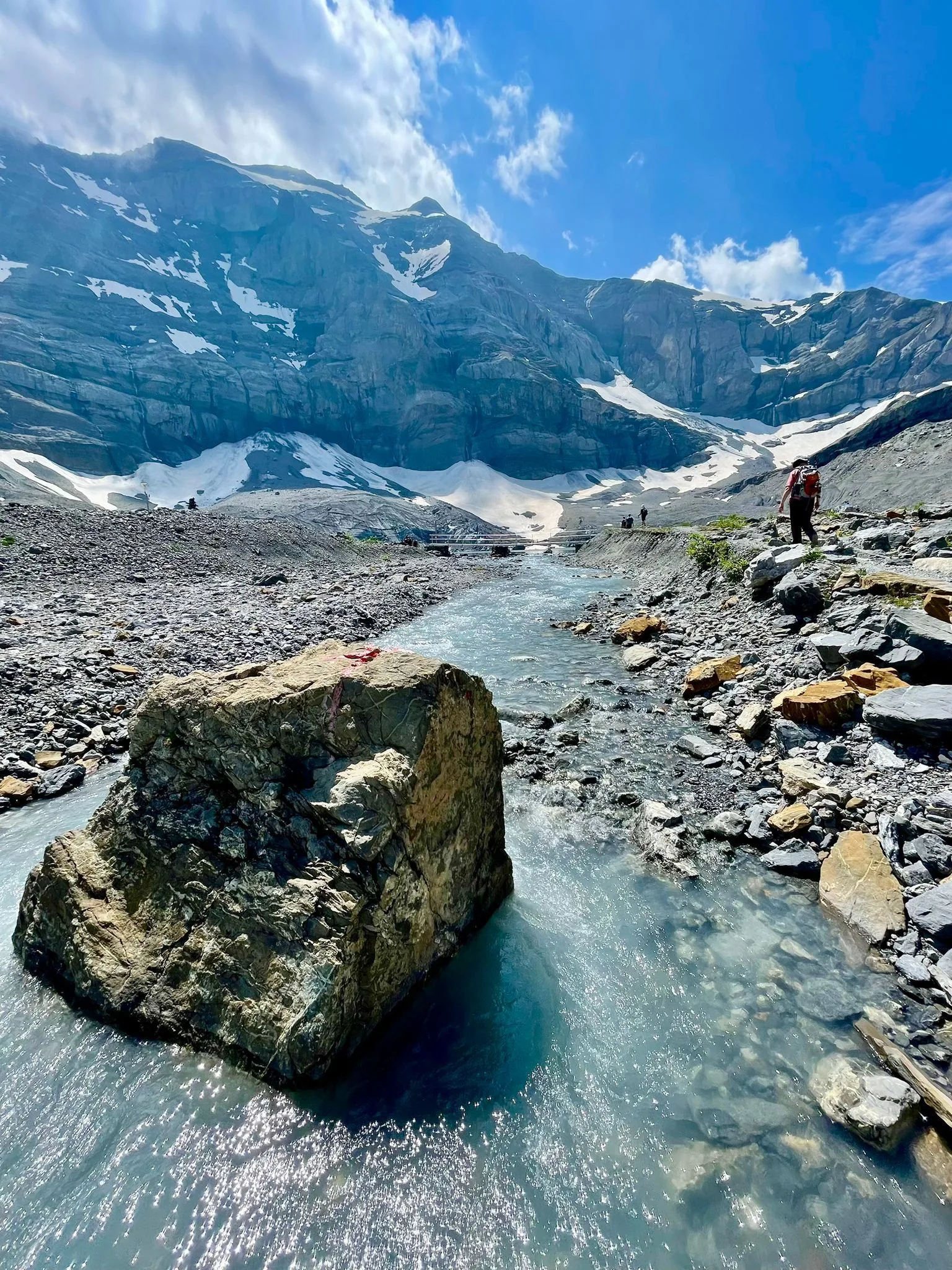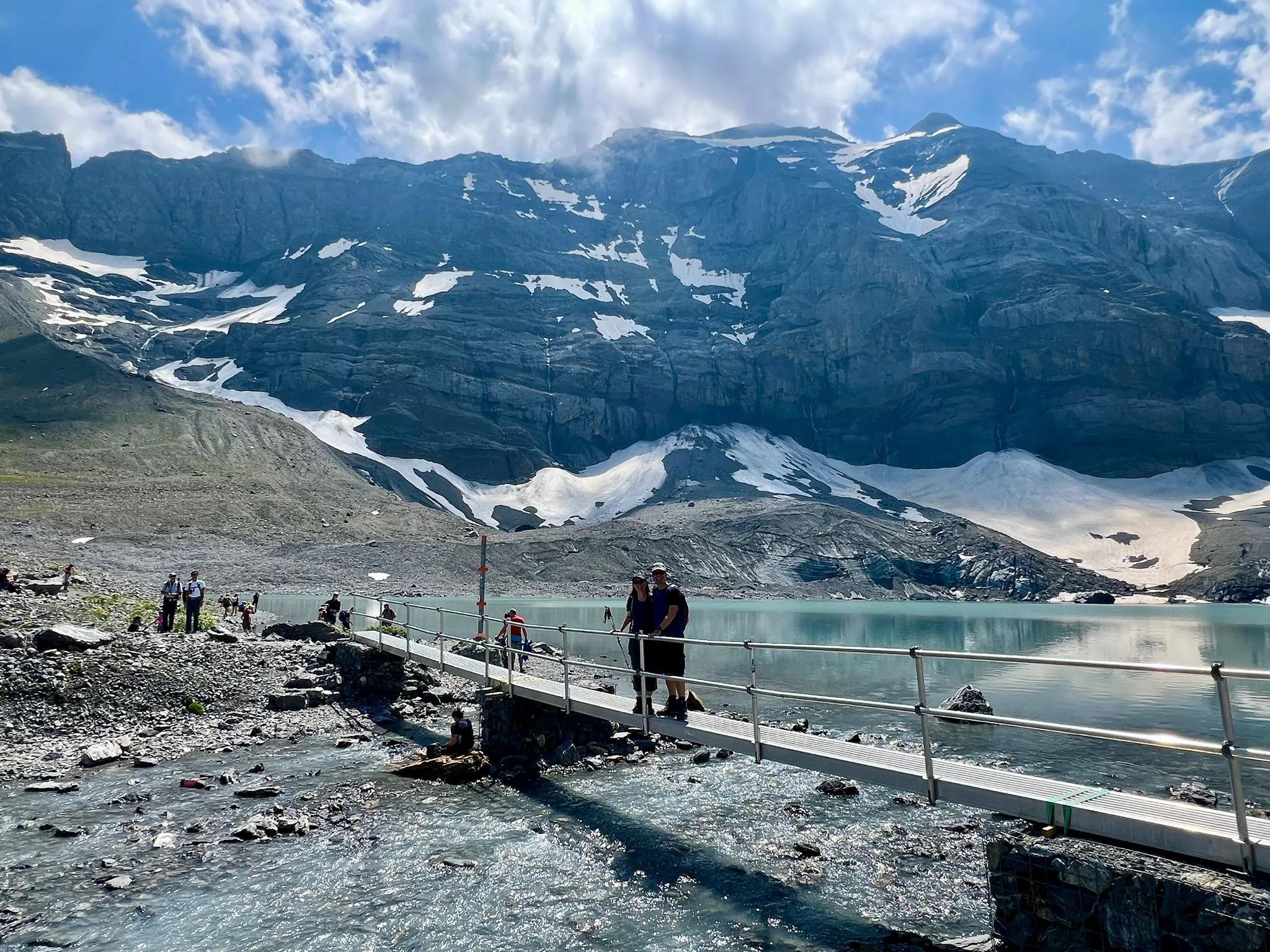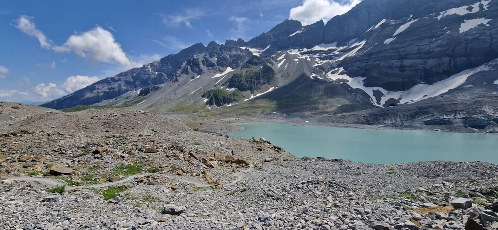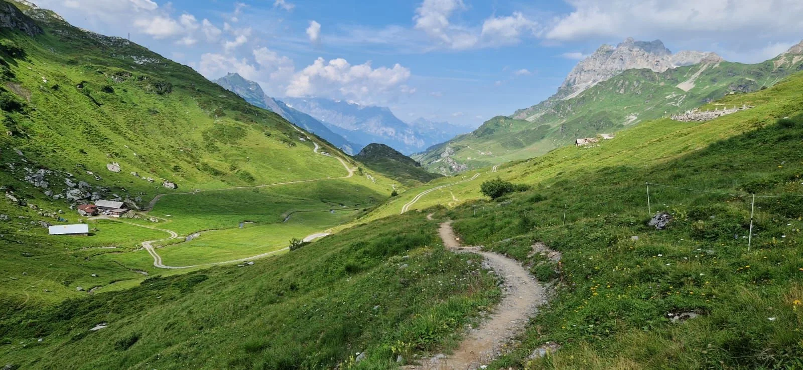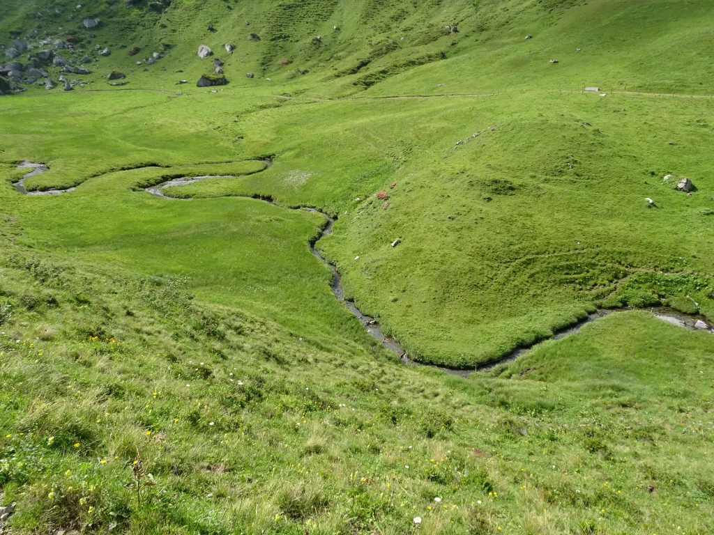 So trafen sich aber 10 stramme Wandernde beim Hotel Klausenpass zum Kaffee. Danach ging es los. Bei schönstem Wetter zogen wir Richtung Klausenpass, der Weg gesäumt von saftigem Grün und herrlich blühenden Blumen. Über Mälchbödemli erreichten wir den kleinen See Im Gries. Dieser entstand in den letzten Jahren aus dem Nichts, gleichzeitig verschwand der Gletscher in der Nordwand des Clariden fast vollständig.