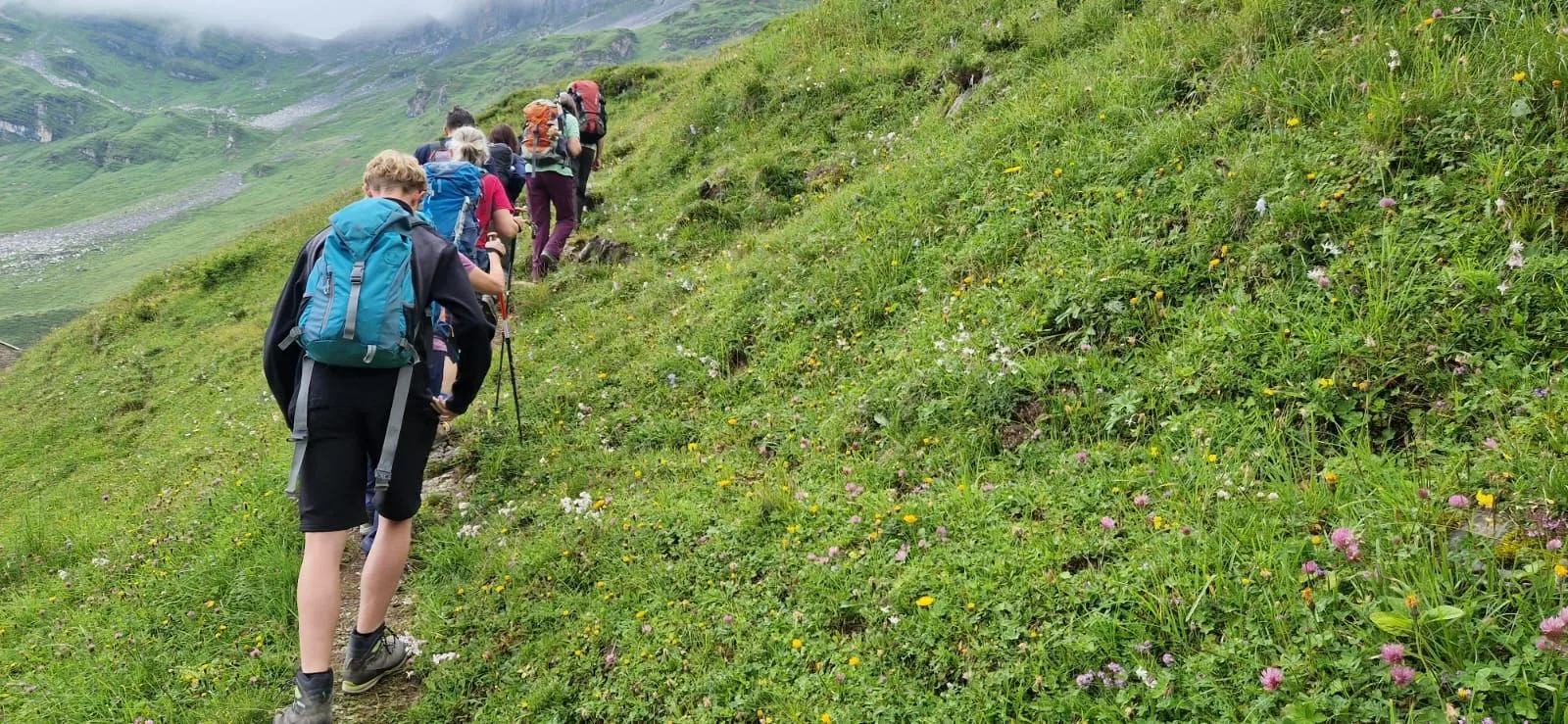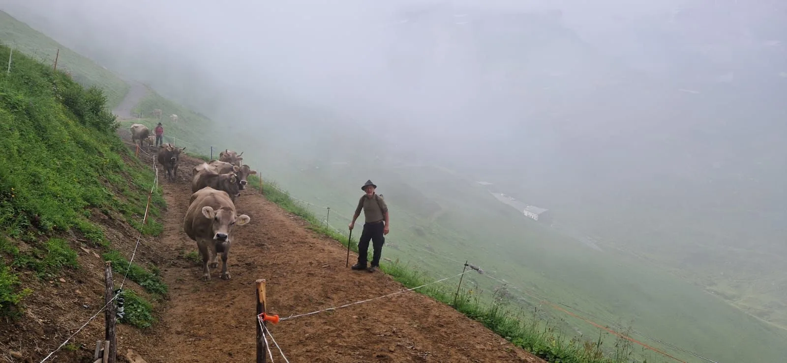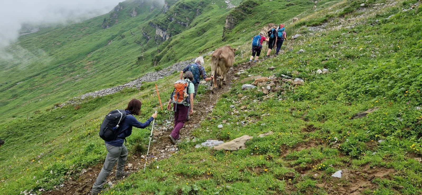 Am nächsten Morgen verlief der Aufstieg zum Balmer Grätli etwas anders als geplant. Wir gerieten in den Auftrieb einer Kuhherde und mutierten kurzerhand zu Alp-Gehilfen! Der Vorteil: man merkte fast nicht, dass wir dabei einen grossen Teil des Aufstiegs bodigten.