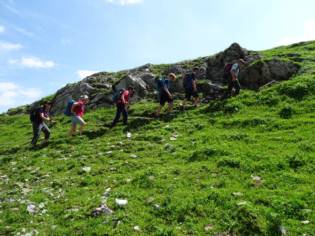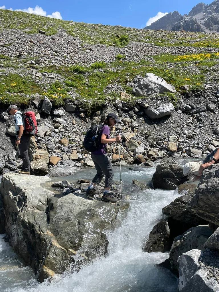 Nach dem See wartete mit der Überquerung des Wildbaches das erste wirkliche Abenteuer auf uns! Das Problem wurde mit entweder mutigen oder wilden Sprüngen gemeistert. Der herrliche Sonnenschein verlangte in der Folge seinen Zoll durch steigende Temperaturen!