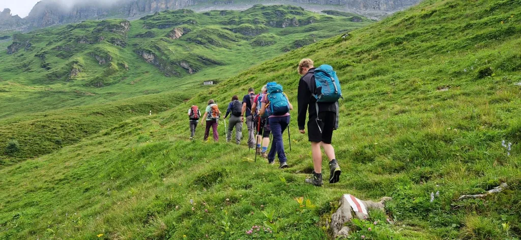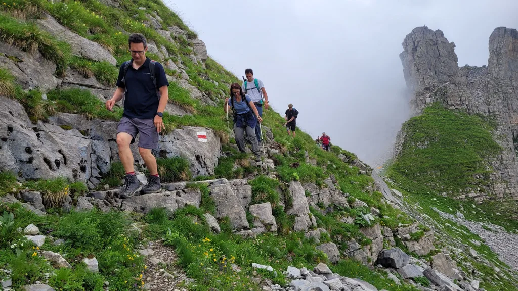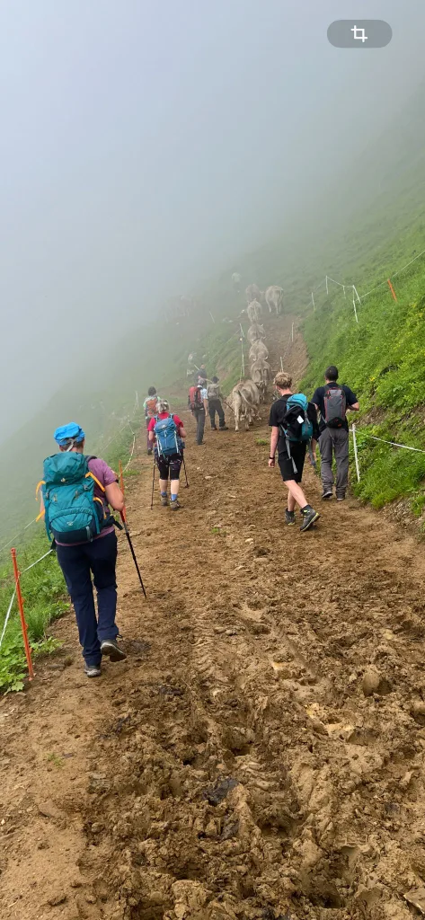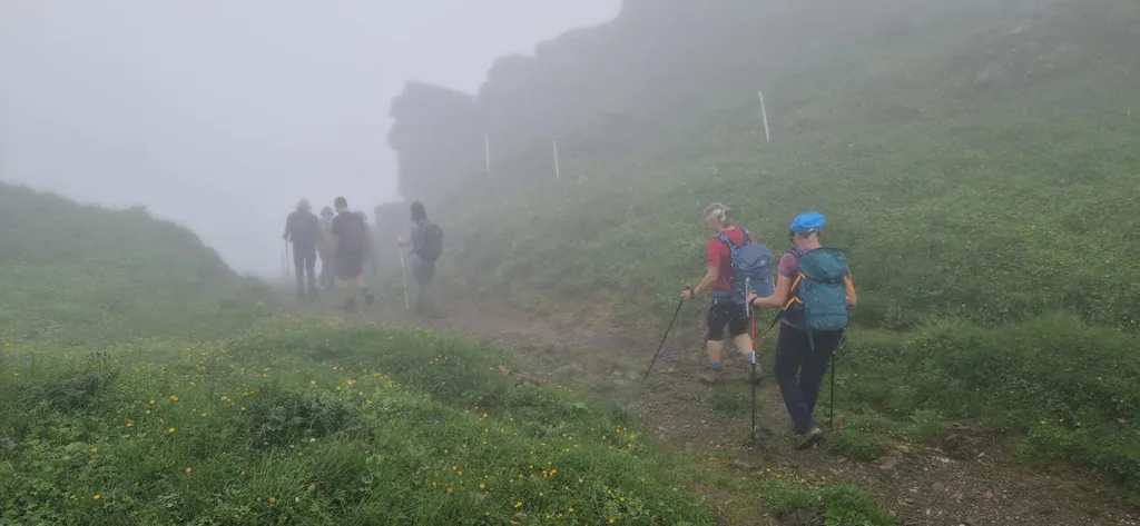 Trotz dichtem und zeitweise feuchtem Nebel erreichten wir die hübsche Alpbeiz Heidmannegg, wo wir den Durst stillten und sich alle an einer Suppe gütlich taten. Der restliche Teil des Weges war klassische Wanderarbeit – und diesmal gab es über den Wildbach eine Brücke 😎