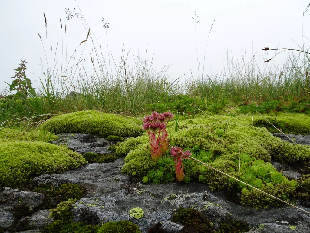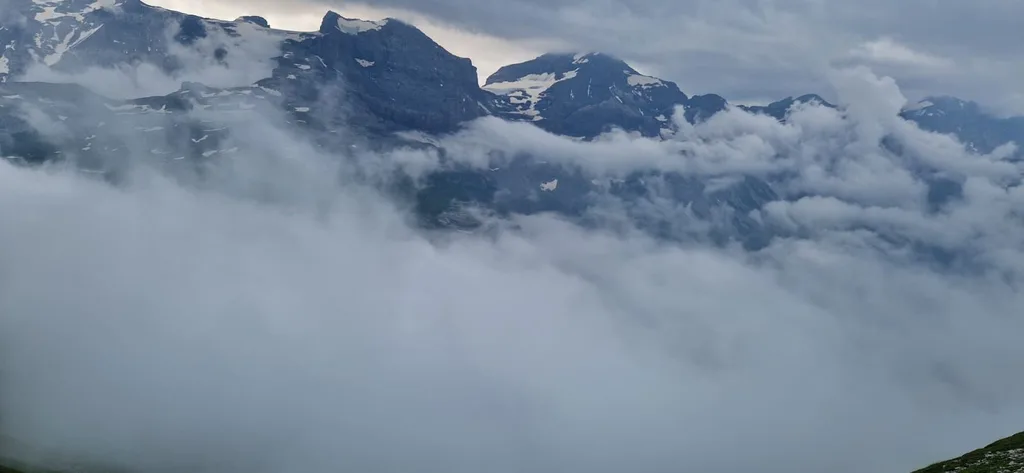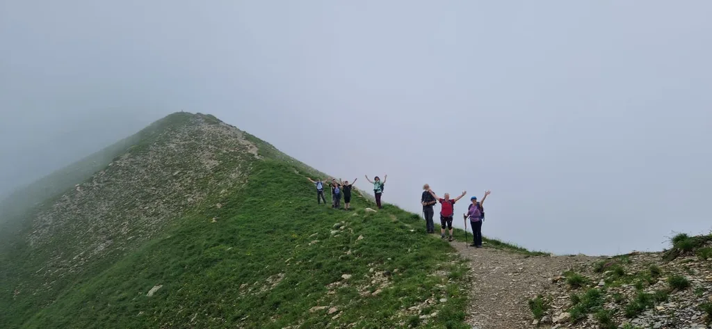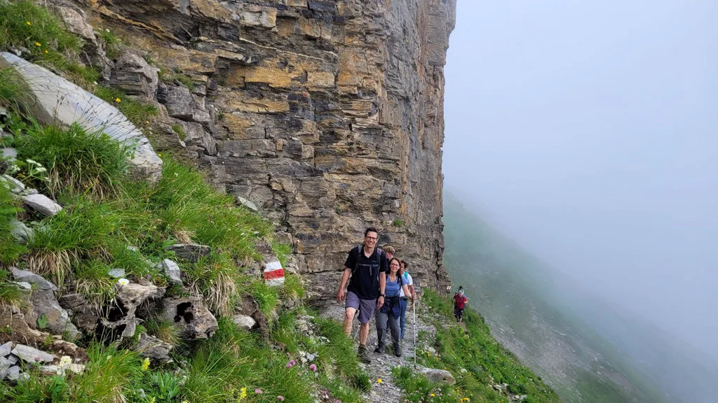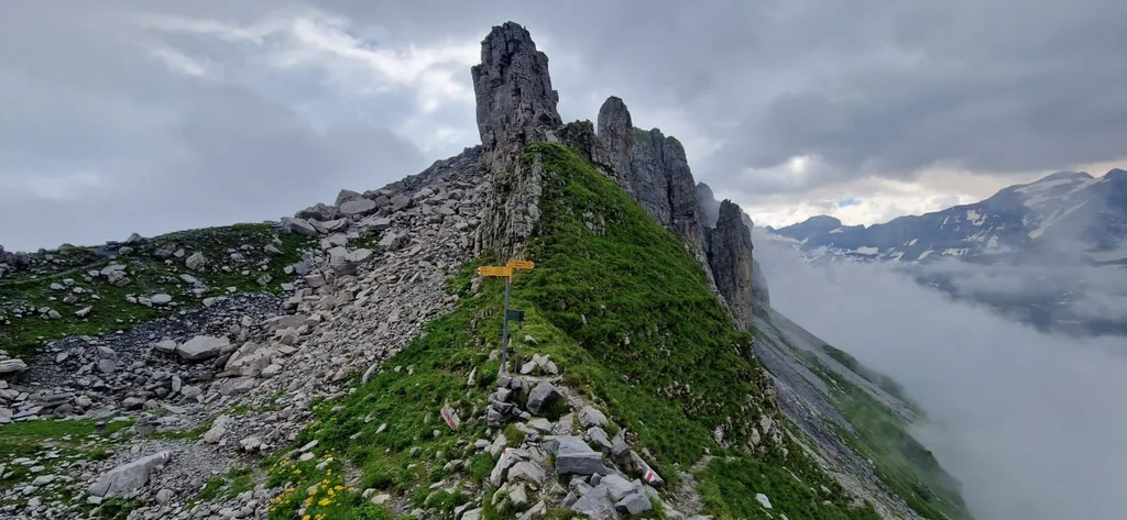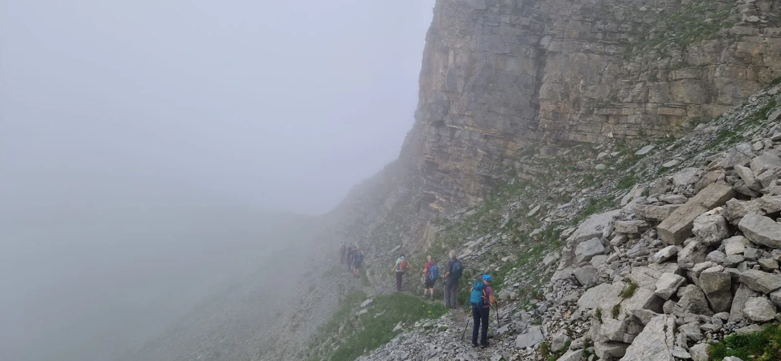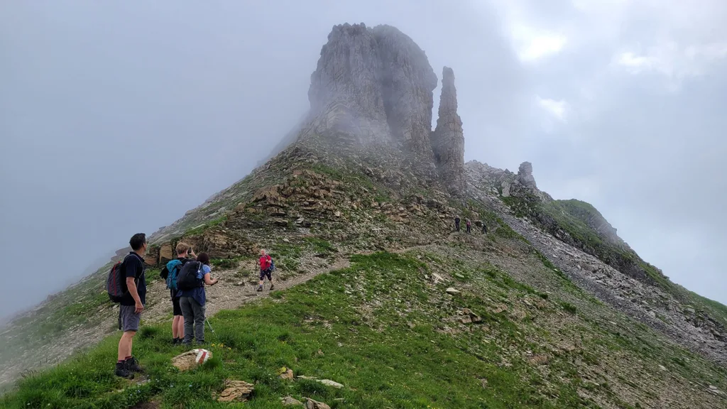 Nach einer kurzen Rast auf dem Grat bot sich uns einen Moment so etwas wie eine Aussicht, ehe der Nebel sich alles einverleibte. Auf schmalem Pfad in steilen Hängen, unter senkrechten Felswänden und zuoberst auf Rücken ging es weiter. Immer wieder waren wir beeindruckt von mächtigen Türmen, die über uns aufragten, deren Spitze sich aber fast im Nebel verlor.